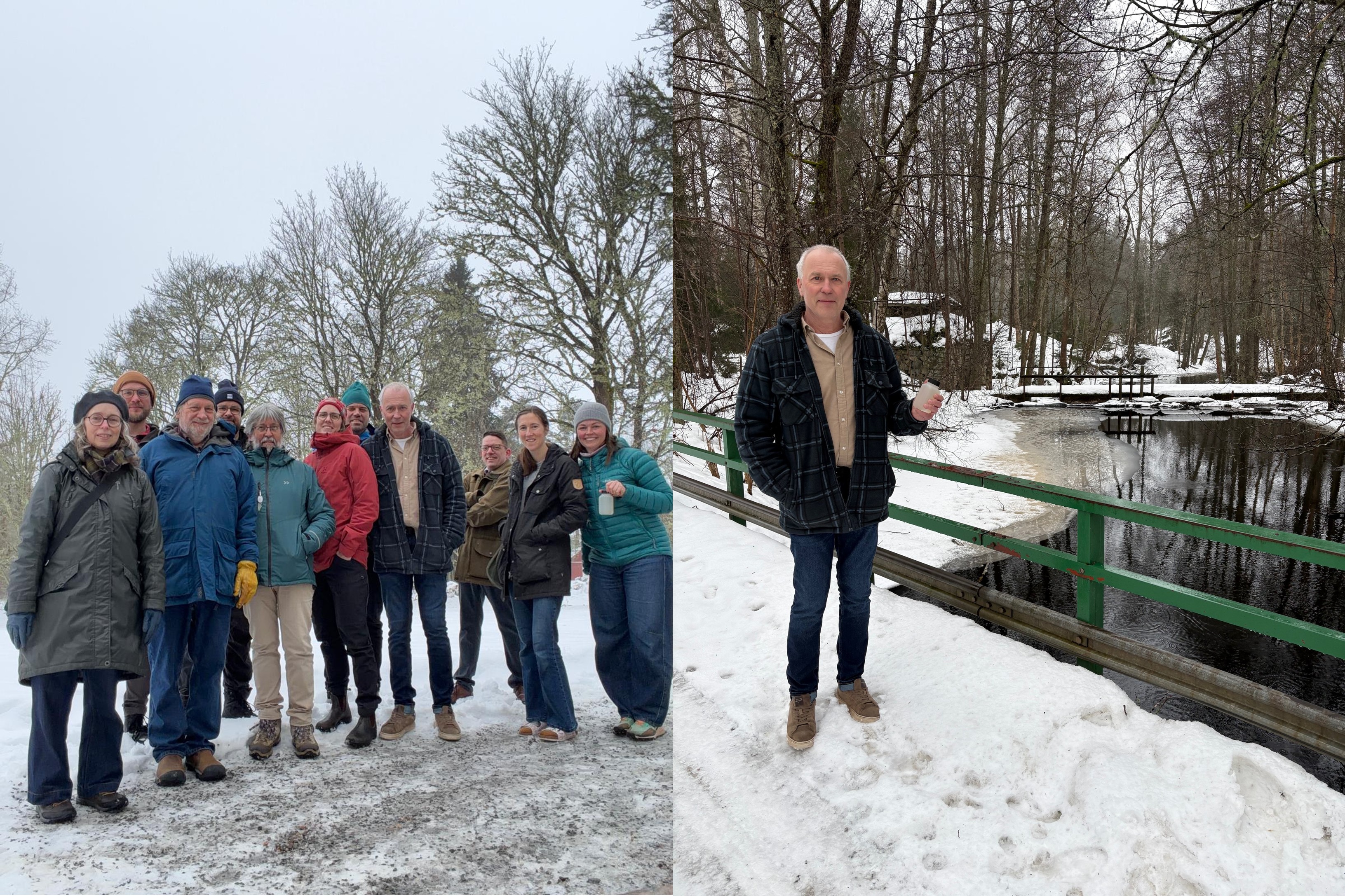 Left: The SITES staff who participated at the Water Tech workshop (photo: Matilda Andersson); Right: Gunnar Jansson, Station Manager of SITES Grimsö, with the first water sample collected near the field station (photo: Marcus Wallin)