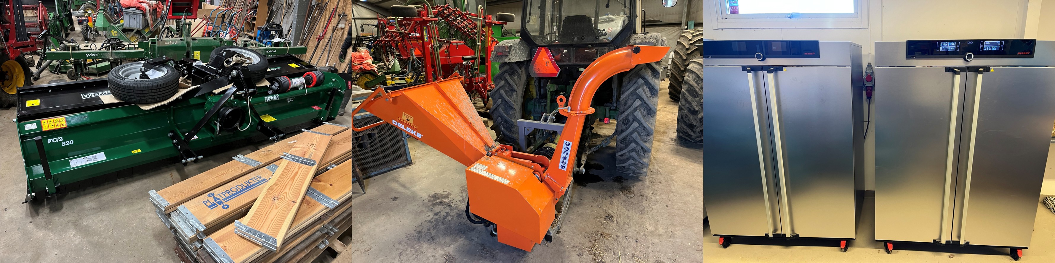 The new equipment purchased at SITES Lönnstorp. From left to right: flail mower, wood chipper and ovens for drying plant materials (photo: Johannes Albertsson)